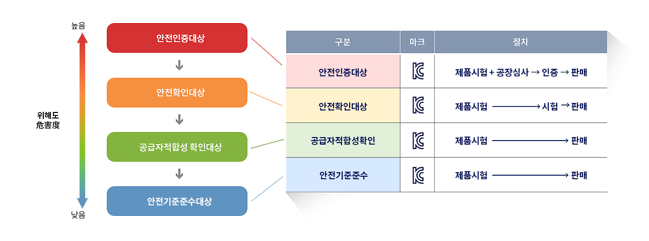 ‘KC인증’을 부여하는 제도입니다. 위해(危害) 수준에 따라 해당하는 각 안전인증, 안전확인, 공급자적합성확인, 안전기준준수 등의 인증을 받지 않으면 해당 제품은 국내에서 제조, 수입, 판매가 불가능합니다.